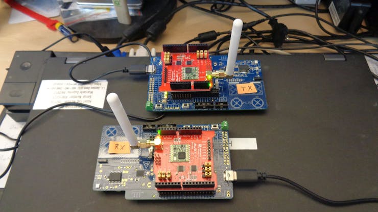Figure 1 shows both PSoC 6 MCU pioneer kits with mounted Dragino LoRa shield. One kit has running a transmitter software, the other one has been configured as receiver.