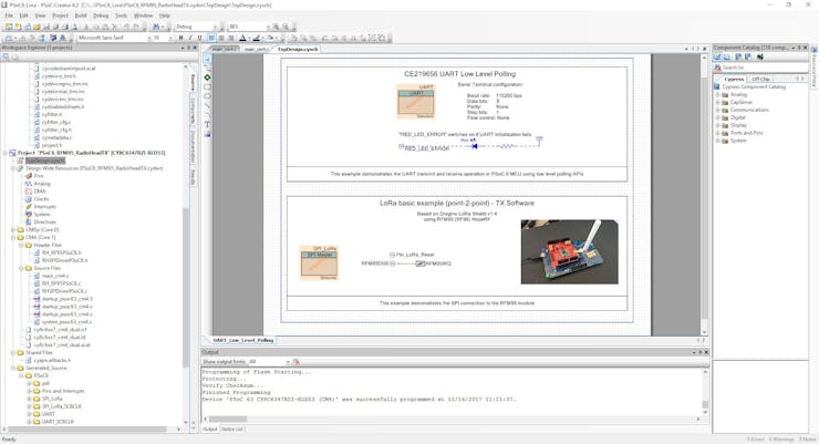 The radio module is interfaced by SPI. Further one external interrupt is used to indicate radio events. The project has been realized by PSoC Creator, see Figure 2, having the components configured accordingly. Additionally, an UART and LED has been configured for HMI and debug channel.